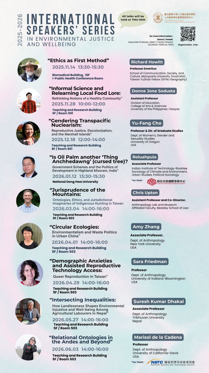 臺北醫學大學 人文暨社會科學院 人文創新與社會實踐研究中心 誠摯邀請您參加「環境正義與福祉」國際講者系列講座(2025–2026)。