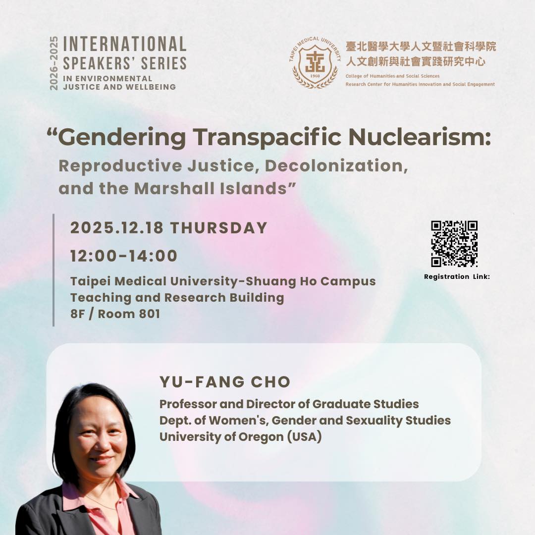 臺北醫學大學 人文暨社會科學院 人文創新與社會實踐研究中心正在舉辦一場為期一年的「環境正義與福祉」國際講者系列講座,旨在突顯平等、生態和健康之間的交集。