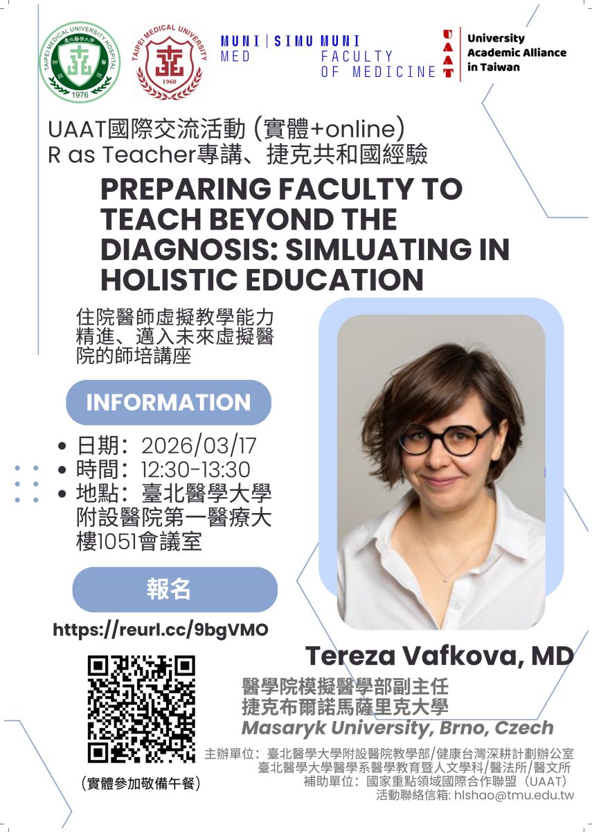 在國家重點領域國際合作聯盟 (UAAT) 的支持下,榮幸邀請到來自捷克布爾諾馬薩里克大學(Masaryk University)的頂尖學者,分享模擬醫學在教育中的創新實踐與國際趨勢。
